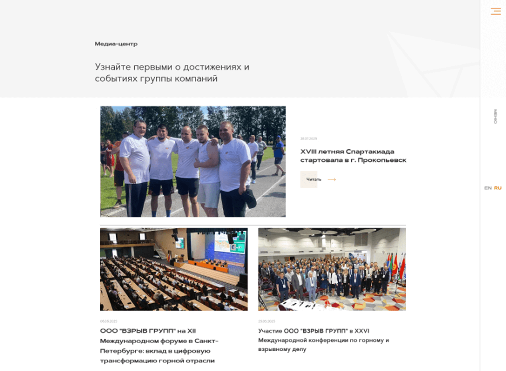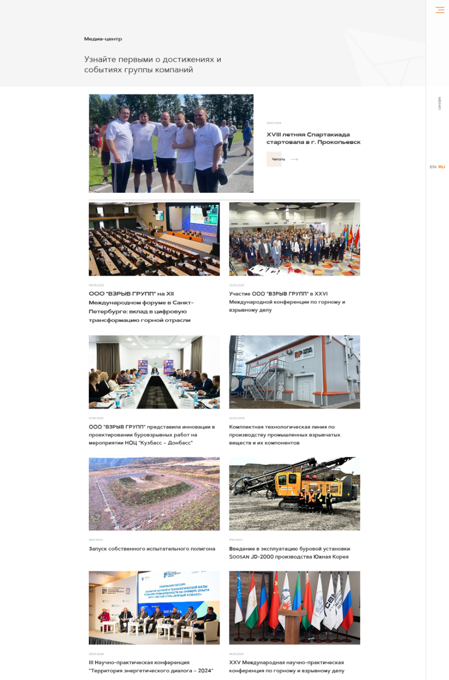 Группа компаний предоставляет комплекс услуг: проведение буровзрывных работ, изготовление и поставка высококачественных промышленных взрывчатых веществ и систем инициирования. Это мы отразили на главной странице сайта, используя наш любимый подход — производственные показатели. Это неоспоримые факты о группе компаний, которые дают однозначное представление профессионалам рынка о возможностях и масштабе деятельности нашего клиента. Мы считаем, что лучший способ презентации — факты и цифры, выполненные в строгом и минималистичном стиле.